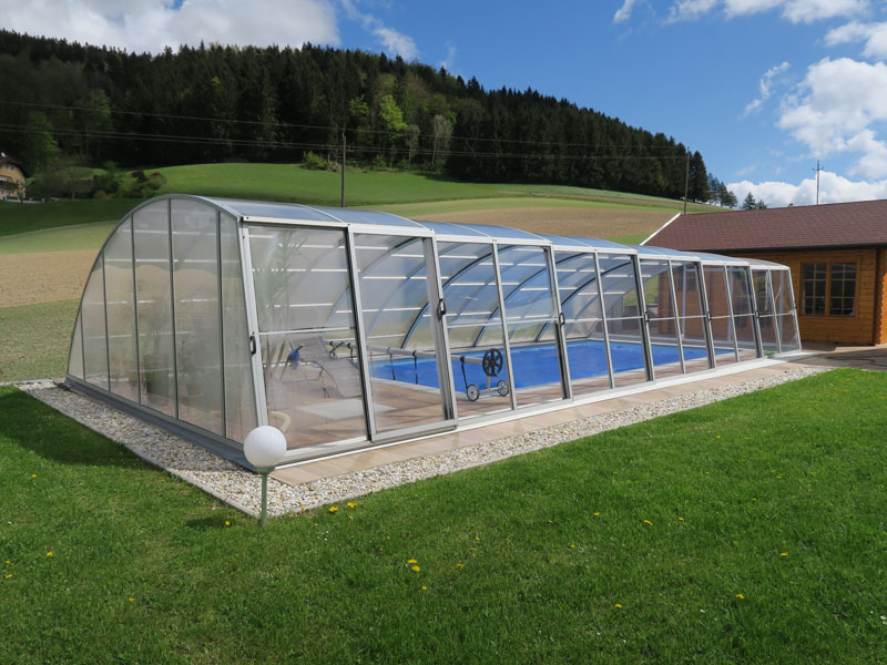 Damit Sie die Frühjahrs- und Herbstmonate in Österreich am eigenen Pool noch besser genießen können, haben wir die erhöhten Dachtypen entwickelt. Sie haben die Möglichkeit, das Becken mit vollständig geschlossener Überdeckung zu nutzen, sodass Sie nicht nur von der erhöhten Wasser-, sondern auch von angenehmen Lufttemperaturen profitieren.